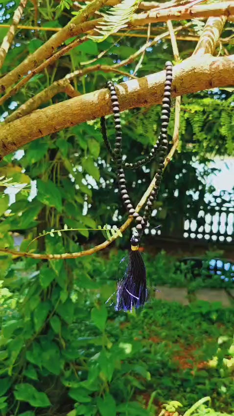 A sleek and comfortable spiritual mala crafted from genuine Karungali (Ebony) wood with finely polished 6 mm beads. Designed for daily wear, this lightweight mala sits discreetly under a shirt or kurta, making it ideal for temple visits, satsang, and moments of quiet devotion. Each piece reflects the natural beauty of authentic ebony wood, with unique grain and shade variations.